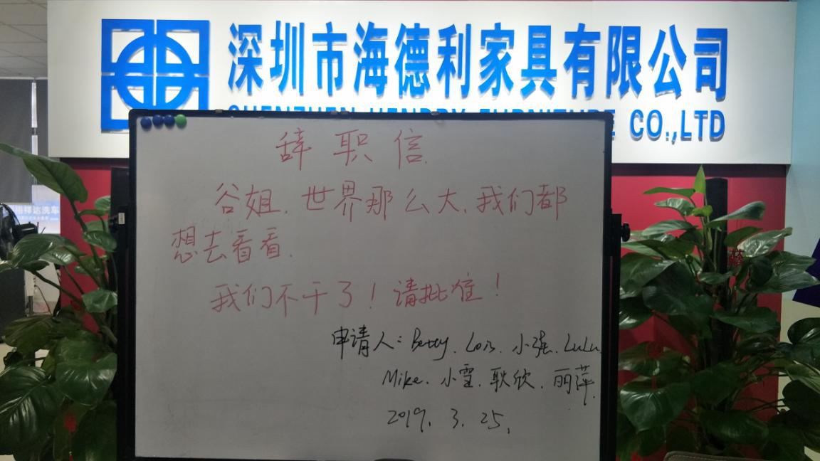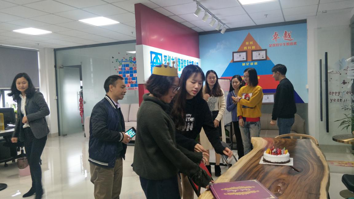 2019年3月25 日(農曆2月19日)是公司外貿部老總穀姐的生日,是一個充滿驚喜的好日子(zǐ)。早上九(jiǔ)點鍾,穀先生便(biàn)叫我帶上筆記本陪同穀姐一起出發外(wài)貿部,一到外貿部門口,看到門居然是鎖著的,隔著玻璃門往(wǎng)裏一瞧,天哪!怎麽職(zhí)場裏是空蕩蕩的?今天是星期一,該是上班的時候了,小夥伴們都(dōu)去哪(nǎ)兒了?再仔(zǎi)細一(yī)看,哎呀!門口還擺著一塊白板,上(shàng)麵寫著幾行字,竟然是一封集體辭職信,信是這樣寫(xiě)的:“穀姐(jiě),世界那麽大,我(wǒ)們都(dōu)想去看看,我們不幹了,請批(pī)準(zhǔn)!”。這怎(zěn)麽可能呢?明知不可能,可心急的穀姐急於進去(qù)一探究竟,用指紋鎖不停的按都開不了門,怎麽回事?天天開鎖的指紋怎(zěn)麽突然間不管用了?我和穀先生也在一旁幹著急,穀姐還在不停的(de)用指紋開門,同時打電話想問怎麽回(huí)事,可電話也沒有人接聽,怎麽辦?正在焦急萬分,不知所措時,瞬間發現右(yòu)側的走廊裏飛出了一道亮光,定神(shén)一看,原來是生日蛋糕的燭光,隻見外貿部的小夥(huǒ)伴們齊(qí)唱著生日快樂歌,簇(cù)擁著生日蛋糕緩緩的走過來,我們這才回過神來,原來今天是穀姐的生日,連穀姐也是如夢初醒被驚(jīng)呆了!驚喜!真是大(dà)大的驚喜!
