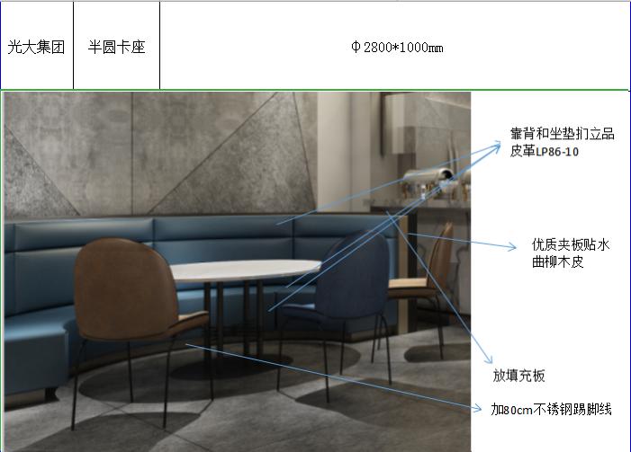 《1》半圓卡座框架用優質夾板貼水曲柳木(mù)皮,靠背和坐墊捫立品皮革LP86-10。原木色油漆,加80mm踢腳線。