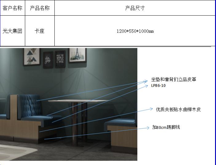 《2》長條(單麵和雙麵)卡(kǎ)座框架(jià)用優質(zhì)夾板貼水曲柳木皮,靠背和(hé)坐墊捫立品皮(pí)革LP86-10。原木色油漆(qī),加80mm踢腳線。