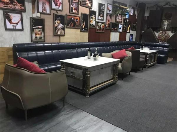 這裏的紅(hóng)色沙發則體現了熱情的氛圍,恣意揮灑出人們活(huó)躍的氣氛,是以真皮為原材料,設計完美,結構簡練、線條流暢、藝術性強、色(sè)彩鮮豔。襯托出酒吧獨特的氣質。則天(tiān)花板的白(bái)紗燈與紫光燈衝突出極強的亮色與周圍的環境和平(píng)相處。再者,茶幾是以玻璃和實木為材料,具有清澈、清新的透明質感,還有實木天然實(shí)用的色澤,使茶幾更加精美、典雅。最後整個酒吧環境的優雅的氣質油然而生。