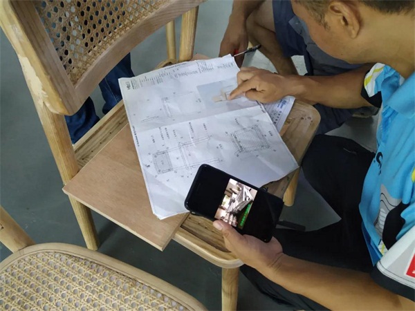 圖為設計師與生產師(shī)傅對(duì)比(bǐ)設計圖測量樣品