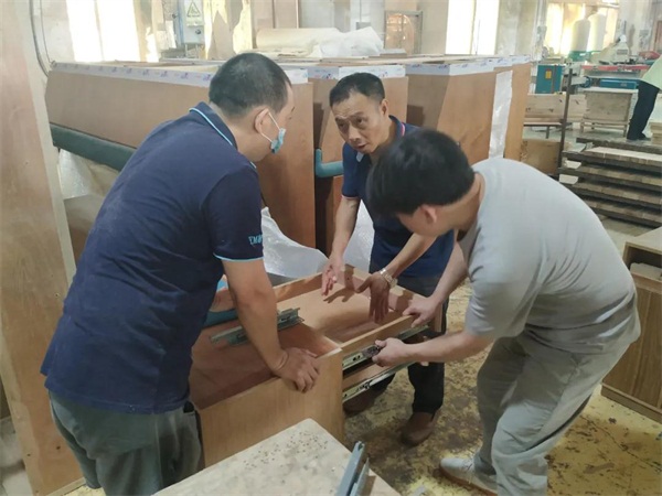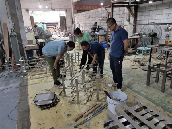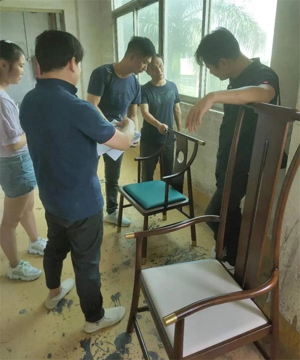圖:海(hǎi)德利設計(jì)團隊與魚界餐飲(yǐn)公司團隊一起檢測家具質量(liàng),優化家具工(gōng)藝
