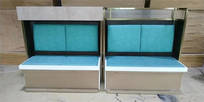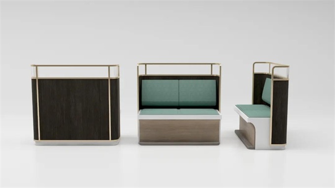 不(bú)鏽(xiù)鋼卡座框架上麵用亞克力裝飾,使得每一張卡座的弧度顯得很柔軟,貼身的皮革軟包,讓整個卡座很有貴氣。