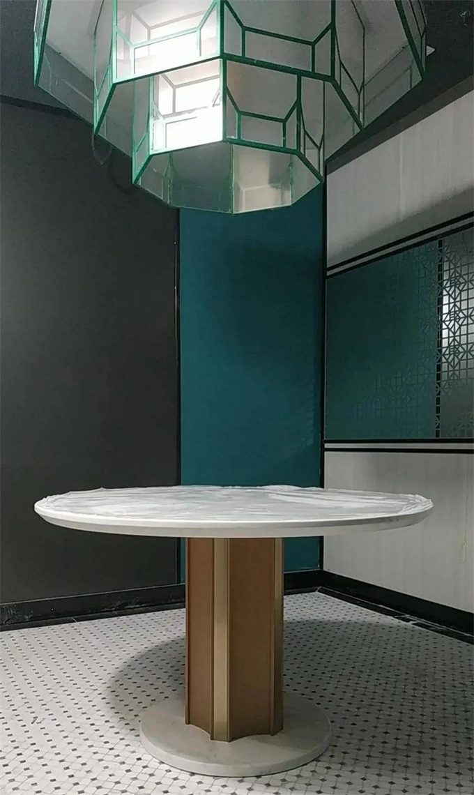 圖:大(dà)理石底盤不鏽鋼桌柱(zhù)大理石台麵餐(cān)桌