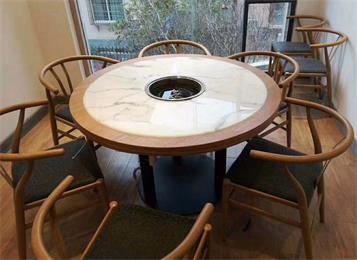實木邊框大理(lǐ)石台麵串串(chuàn)香電磁(cí)爐液化灶實木(mù)火鍋桌椅